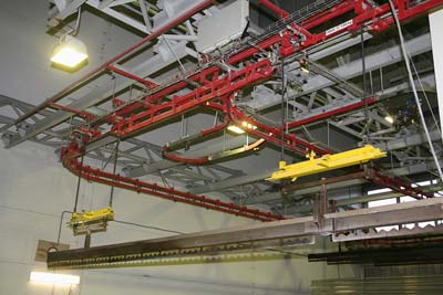 Конвейерная система представляет собой подвесной, монорельсовый, грузонесущий, непрерывно движущийся конвейер для перемещения изделий по технологическим стадиям.